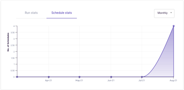 In first tab, you can compare number of chaos scenario runs according to selected granuality i.e. Daily/Monthly/Hourly. Granuality can be changed using drop-down in top right corner.